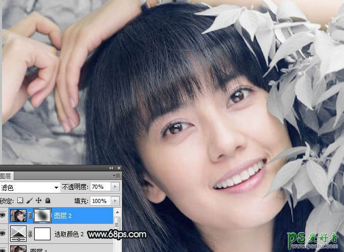5、新建空白图层,按CTRL+SHIFT+ALT+E盖印空白图层,并设置图层的混合模式为滤色,图层的不透明度为70%,使用黑色画笔擦去人物脸部部分,效果如图。