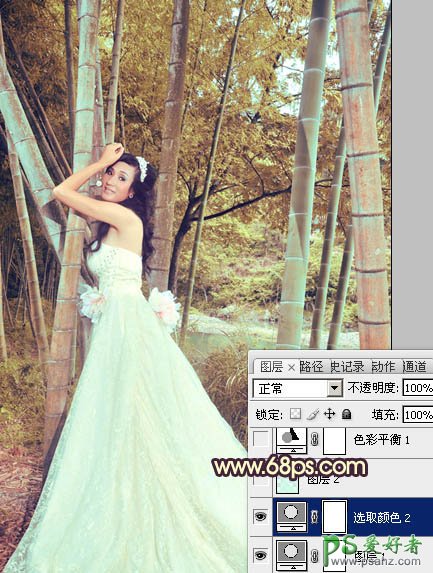 PS调色教程:给竹林中的柔美少女婚纱艺术照调出暖色效果