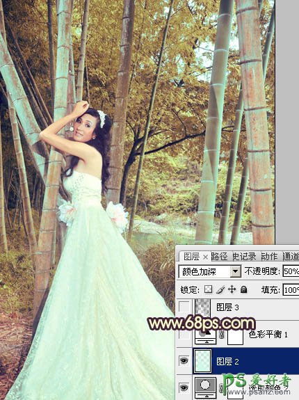 4、按Ctrl + Alt + ~ 调出高光选区,新建一个图层填充淡青色:#CFFAE7,混合模式改为“颜色加深”,不透明度改为:50%,效果如下图。这一步给图片的高光部分增加淡青色。