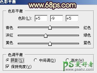 5、创建色彩平衡调整图层,对阴影、中间调、高光进行调整,参数设置如图14 - 16,效果如图17。这一步微调各层次的颜色,增加图片的层次感。