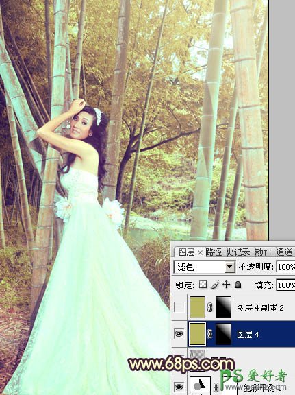 7、新建一个图层填充黄绿色:#B9B764,混合模式改为“滤色”,按住Alt键添加图层蒙版,用白色画笔把右上部擦出来,效果如下图。