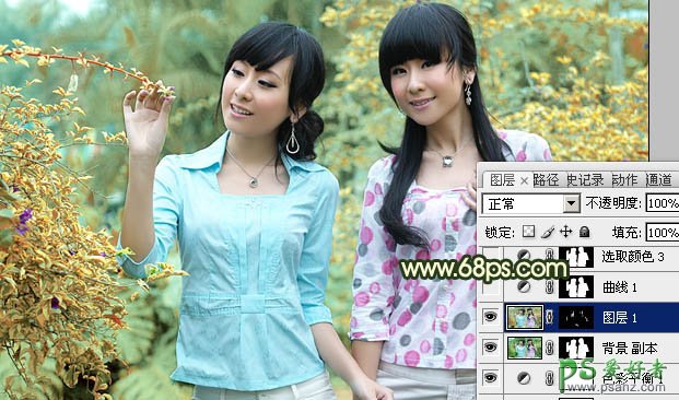 6、调出人物部分的选区,创建曲线调整图层,对RGB、红、蓝进行调整,参数设置如图14,效果如图15。这一步调整人物部分的颜色。