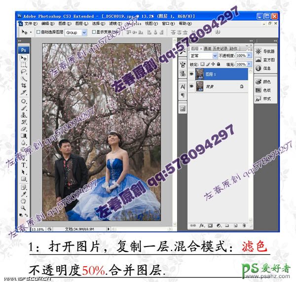 1、打开原图素材,把背景图层复制一层,混合模式改为“滤色”,不透明度改为:50%,然后合并图层。