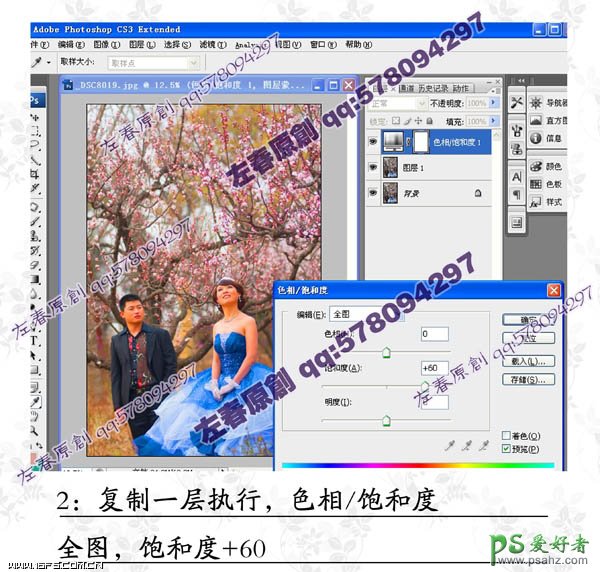 今天我们来和大家一起学习一篇PS婚片后期调色实例教程,photoshop给春日桃园里的婚片男女写真照调出暖暖的色调,素材图片有点偏灰,可能是天气原因造成的。可以适当增加图片的饱和度来还原图片的色彩。然后再局部调整背景及人物的颜色,做出自己满