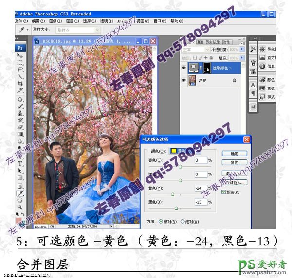 photoshop给春日桃园里的婚片男女写真照调出暖暖的色调