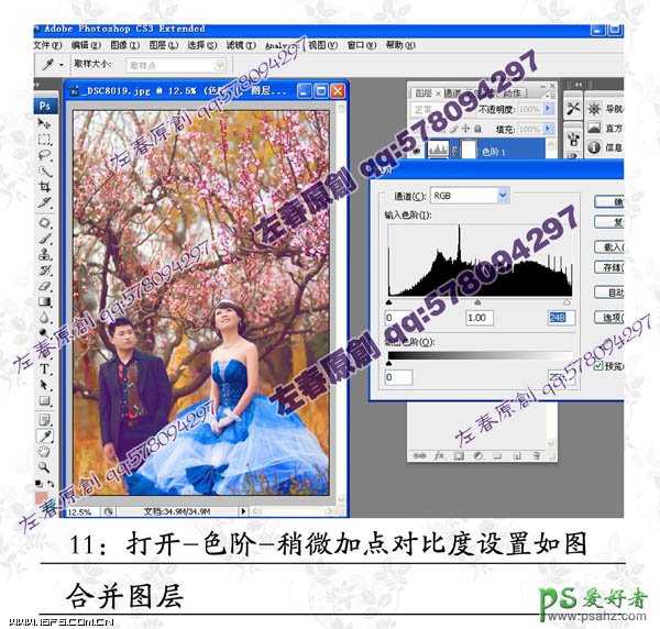 photoshop给春日桃园里的婚片男女写真照调出暖暖的色调
