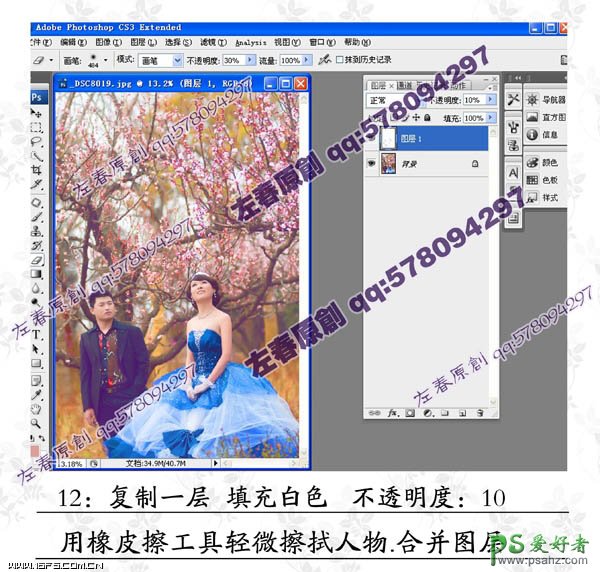 12、新建一个图层,太南车白色,不透明度改为:10%,用橡皮擦把人物部分擦出来,然后合并图层。