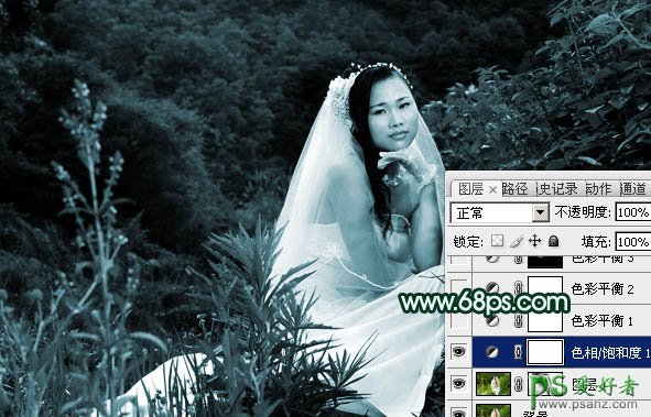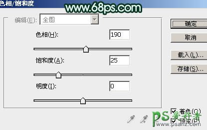 2、创建色相/饱和度调整图层,勾选“着色”后再调整,参数设置如图2,效果如图3。这一步快速把图片转为青色调。