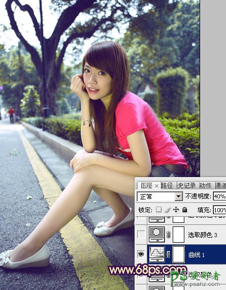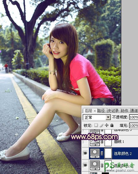 PS调色教程:给公路边坐着的红衣美腿少女图片调出灿烂的暖色