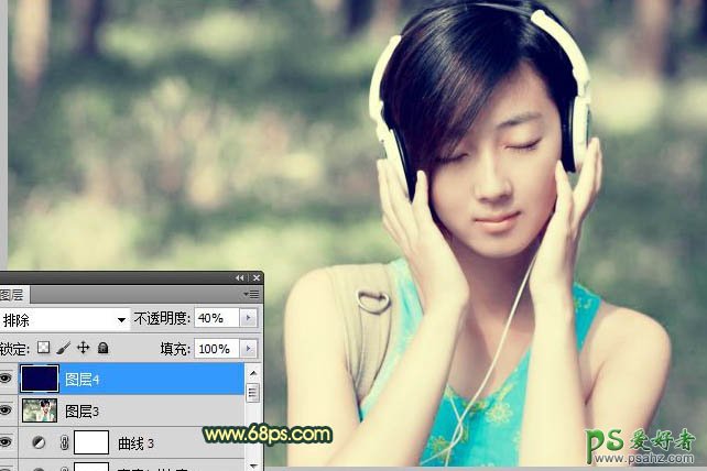 10、新建空白图层填充颜色:#03004c,设置图层的混合模式为排除,图层不透明度为40%,如图。