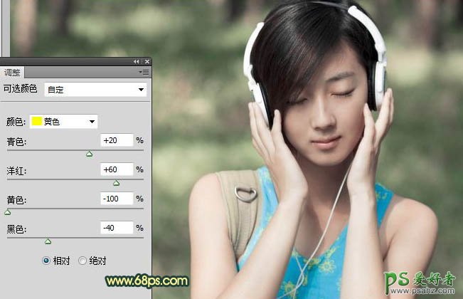 4、由于照片中的人物有些偏黄,创建可选颜色调整图层,选择黄色组,参数如图,效果如图。