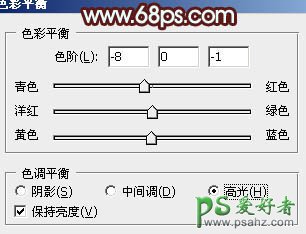 9、创建色彩平衡调整,对高光进行调整,参数设置如图21,确定后把图层不透明度改为:30%,效果如图22。这一步微调高光颜色。