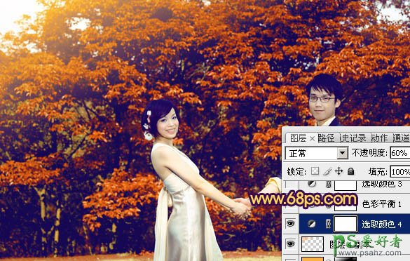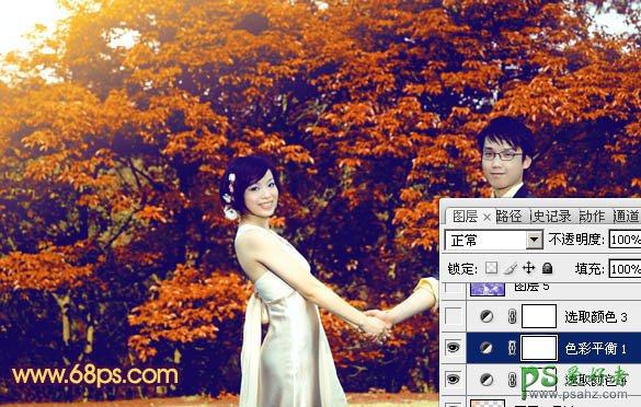 PS调色教程:给树林中的情侣婚片调出灿烂的橙红色
