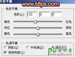 10、创建色彩平衡调整图层,对高光进行调整,参数设置如图25,效果如图26。