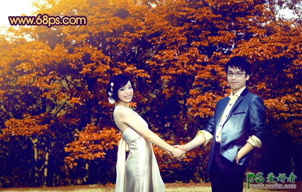 PS调色教程:给树林中的情侣婚片调出灿烂的橙红色