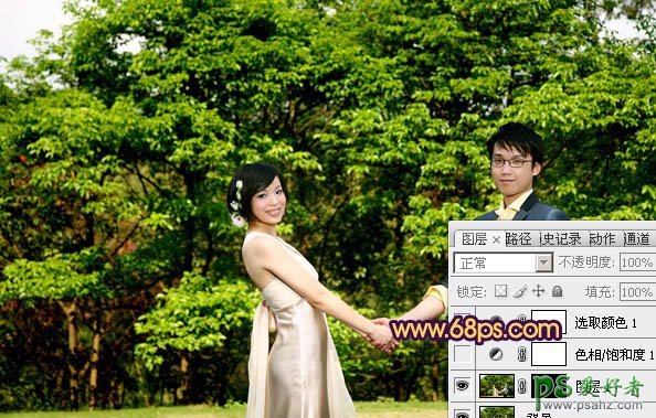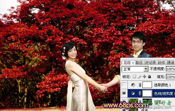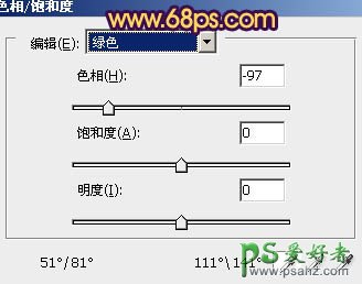 2、创建色相/饱和度调整图层,选择绿色,用吸管吸取背景树叶颜色再调整,参数设置如图2,效果如图3。这一步把绿色转为红色。
