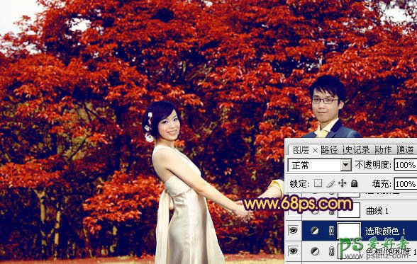 PS调色教程:给树林中的情侣婚片调出灿烂的橙红色