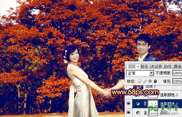 PS调色教程:给树林中的情侣婚片调出灿烂的橙红色