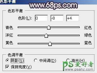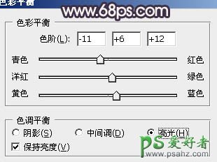 5、创建色彩平衡调整图层,对阴影,高光进行调整,参数设置如图8,9,效果如图10。这一步增强画面的亮度。