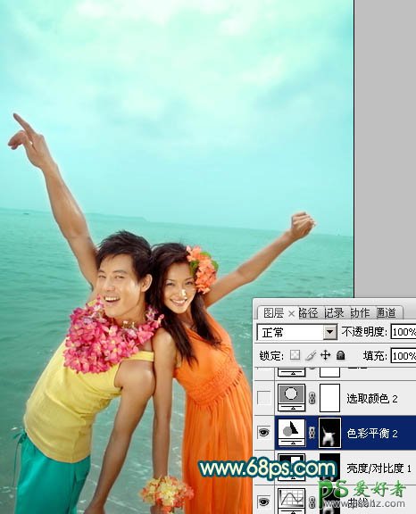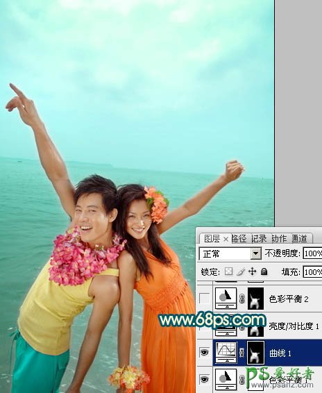 photoshop给喜气的海景情侣图片调出艳丽的青黄色