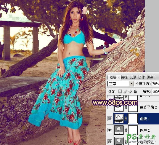photoshop给海滩上性感的人体少女图片调出柔美的暗调暖色