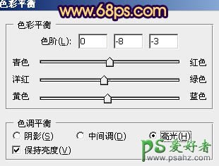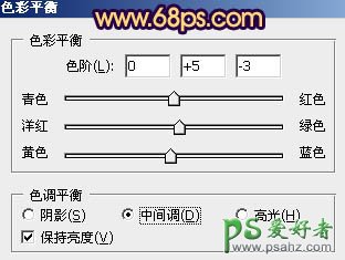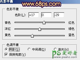 6、创建色彩平衡调整图层,对阴影、中间调、高光进行调整,参数设置如图16 - 18,效果如图19。这一步微调整体颜色。
