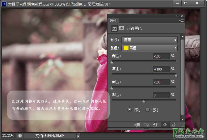 3、继续调整可选颜色,选择黄色,这一步是调整人物背景的颜色,因为我想要背景和衣服的颜色匹配。