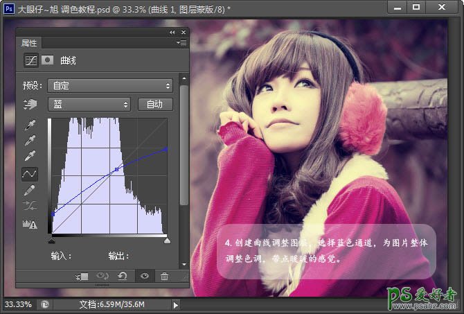 4、创建曲线调整图层,选择蓝色通道,为图片整体调整色调,带点暖暖的感觉。