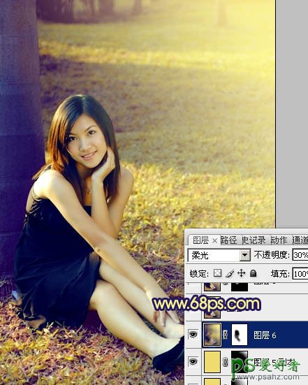 11、新建一个图层,盖印图层。执行:滤镜 > 模糊 > 高斯模糊,数值为5,确定后把图层混合模式改为“柔光”,不透明度改为:30%,加上图层蒙版,用黑色画笔把人物部分擦出来,如下图。