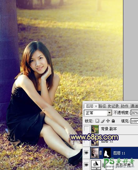14、新建一个图层,盖印图层。进入通道面板,选择绿色通道,按Ctrl + A 全选,按Ctrl + C 复制。选择蓝色通道,按Ctrl + V 粘贴,点RGB通道回到图层面板,效果如图31。按住Alt键添加图层蒙版,用白色画笔把人物部分擦出来,图层不透明度改为:30%,效果如图32。