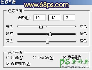 3、创建色彩平衡调整图层,对高光进行调整,参数设置如图6,确定后把蒙版填充黑色,用白色画笔把人物部分擦出来。这一步调整人物部分亮度。