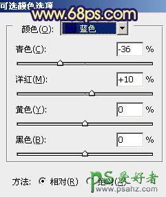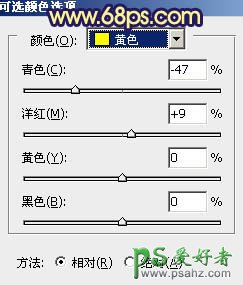 6、创建可选颜色调整图层,对黄、绿、蓝、白、中性、黑色进行调整,参数设置如图12 - 17,确定后用黑色画笔把人物部分擦出来,效果如图18。这一步把草地部分调黄,再加强蓝色部分。