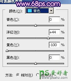 2、创建可选颜色调整图层,对青色,蓝色进行调整,参数设置如图4,5,确定后把图层不透明度改为:60%,效果如图7。这一步加强青色浓度,同时把背景部分蓝色部分转为紫色。