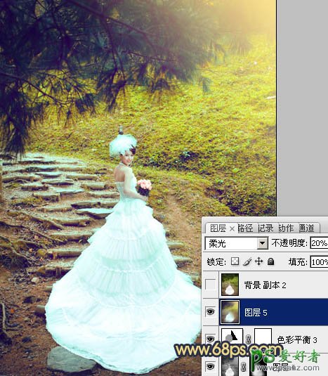13、新建一个图层,盖印图层。执行:滤镜 > 模糊 > 动感模糊,角度为45度,距离为150,确定后把图层混合模式改为“柔光”,不透明度改为:20%,效果如下图。