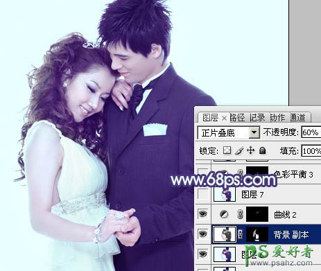 9、把背景图层复制一层,按Ctrl + Shift + ] 置顶,按Ctrl + Shift + U 去色,混合模式改为“正片叠底”,不透明度改为:60%,按住Alt键添加图层蒙版,用白色画笔把人物白色衣服部分擦出来,增加衣服的细节,效果如下图。