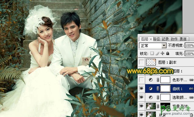 PS婚片后期调色实例教程,photoshop调出古典日光效果情侣婚纱照,素材图片以绿色为主,调色的时候只需要把绿色转为青绿色,再适当把色调调暗一点,高光部分加上一些橙黄色补色即可。 最终效果 原图 1、打开原图素材,按Ctrl + J 把