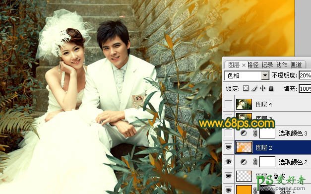 7、按Ctrl + Alt + ~ 调出高光选区,新建一个图层填充橙黄色:#F9A40F,混合模式改为“色相”,不透明度改为:20%,效果如下图。