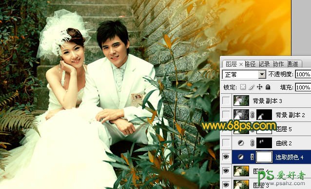 PS婚片后期调色实例教程,photoshop调出古典日光效果情侣婚纱照,素材图片以绿色为主,调色的时候只需要把绿色转为青绿色,再适当把色调调暗一点,高光部分加上一些橙黄色补色即可。 最终效果 原图 1、打开原图素材,按Ctrl + J 把