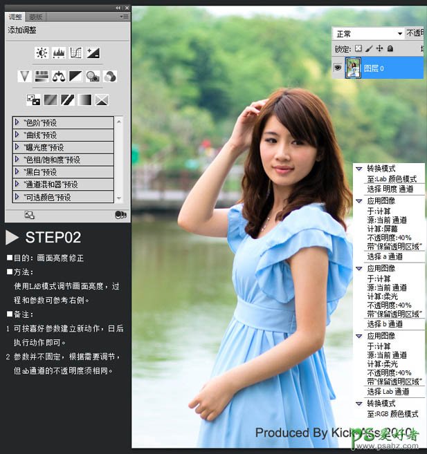 2、目的:画面亮度修正: 方法:使用LAB模式调节画面亮度,过程和参数可参考下图。可按喜好参数建立新动作,日后执行动作即可。 参数并不固定,根据需要调节,但AB通道的不透明度须相同。