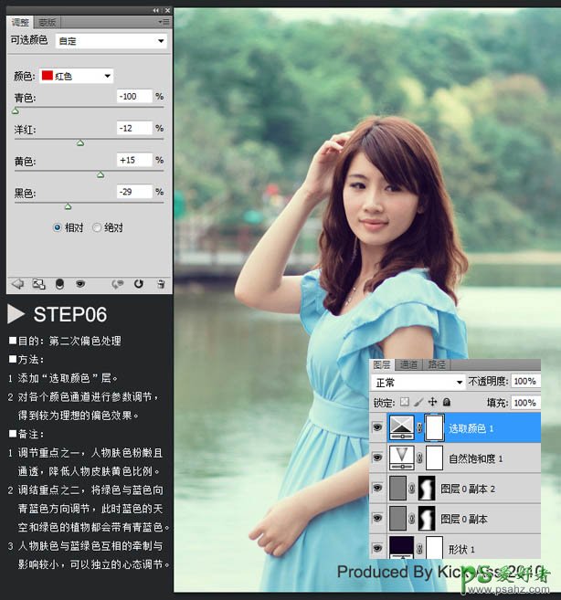 6、目的:第二次偏色处理: 添加‘选取颜色’层。对各个颜色通道进行参数调节,得到较为理想的偏色效果。 备注:调节重点之一,人物肤色粉嫩且通透,降低人物皮肤黄色比例。调节重点之二,将绿色与蓝色向青蓝色方向调节,此时蓝色的天空和绿色的植物都会带有青蓝色。人物肤色与蓝绿气冲冲互相的牵制与影响较小,可以独立的心态调节。