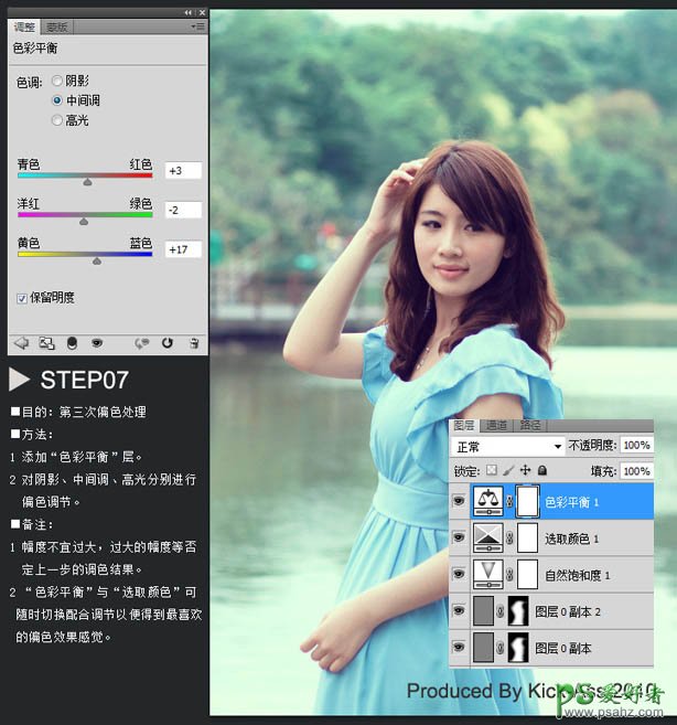 7、目的:第三次偏色处理: 方法:添加‘色彩平衡’层。对阴影、中间调、高光分别进行偏色调节。 备注:幅度不宜过大,过大的幅度等否定上一步的调色结果。色彩平衡与选取颜色可随时切换配合调节以便得到最喜欢的偏色效果感觉。