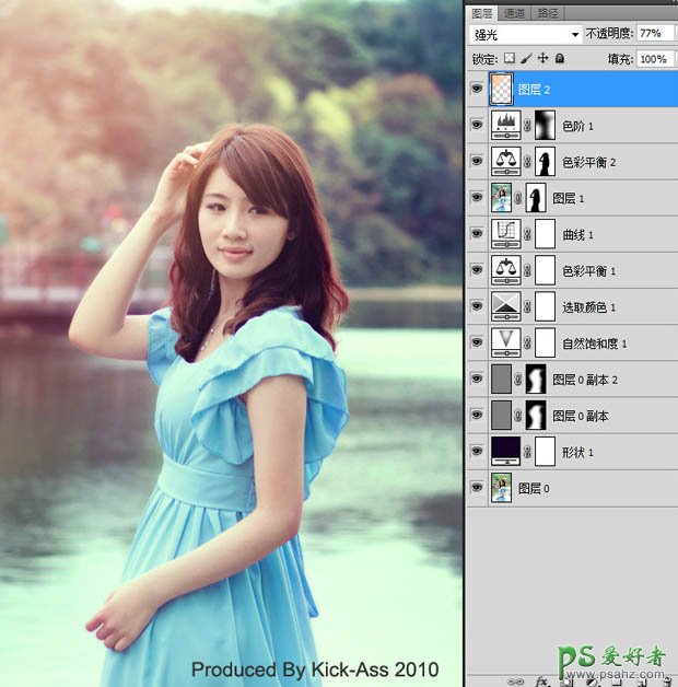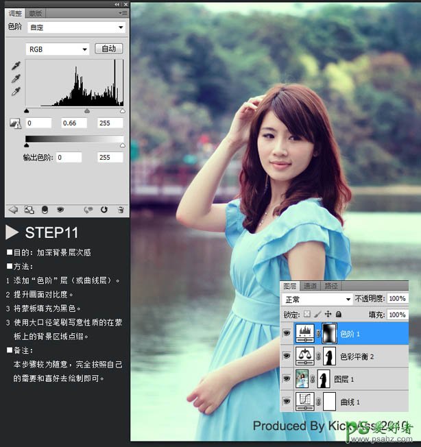 11、目的:加深背景层次感: 方法:添加‘色阶’层(或曲线层),提升画面对比度,将蒙版填充为黑色,使用大口径笔刷写意性质的在蒙版上的背景区域点缀。 备注:本步骤较为随意,完全按照自已的需要和喜好去绘制即可。