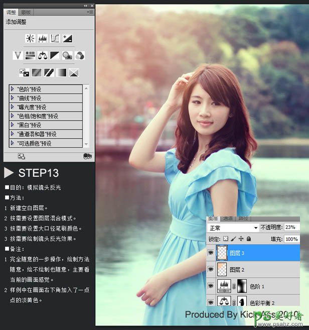 13、目的:模拟镜头反光: 方法:新建空白图层,按需要设置图层混合模式和大口径笔刷颜色,按需要绘制镜头反光效果。 备注:完全随意的一步操作,绘制方法拜物教,绘不绘制也随意,主要看当前的画面感觉。本例中在画面右下角加入了一点点的淡黄色。