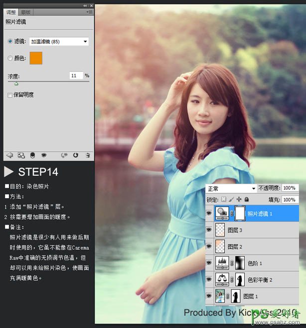 14、目的:染色照片: 方法:添加‘照片滤镜’层,按需要增加画面的暖度。 备注:照片滤镜是很有人用来做后期时使用的,它虽不能像在CaremaRaw中准确的无损调节色温,但却可以用来给照片染色,使画面充满暖黄色。
