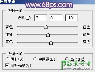 9、创建色彩平衡调整图层,对高光进行调整,参数设置如图20,确定后用黑色画笔擦掉不需要调色的部分,效果如图21。