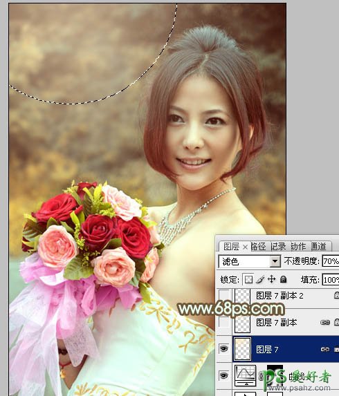 14、新建一个图层,用椭圆选框工具拉出下图所示的椭圆选区,按Ctrl + Alt + D 羽化100个像素后填充淡黄色:#FDEBBD,混合模式改为“滤色”,不透明度改为:70%,效果如下图。