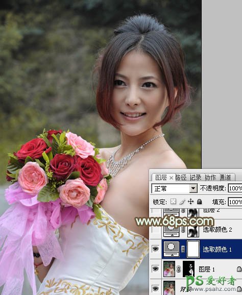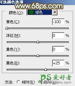 2、创建可选颜色调整图层,对绿色进行调整,参数设置如图2,效果如图3。这一步把背景的滤色转为暗黄色。