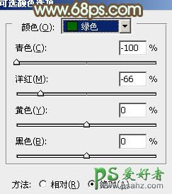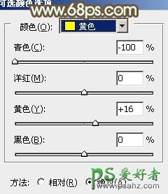 3、创建可选颜色调整图层,对黄色,绿色进行调整,参数设置如图4,5,确定后用黑色画笔把人物部分擦出来,效果如图6。这一步把背景转为较亮的暖色。
