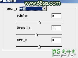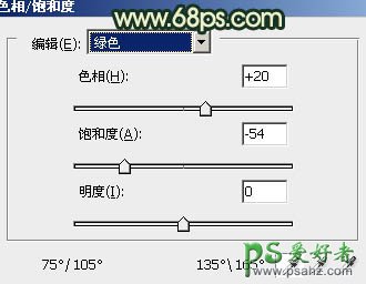 7、创建色相/饱和度调整图层,对全图及绿色进行调整,参数设置如图18,19,效果如图20。这一步降低全图饱和度并改变背景绿色。