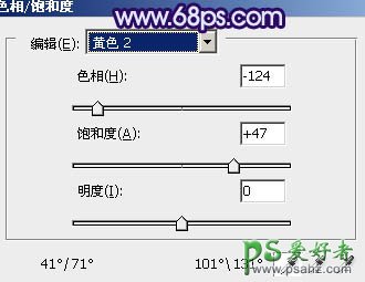 1、打开原图素材,创建色相/饱和度调整图层,选择黄色,用吸管吸取背景绿叶部分颜色再调整,参数设置如图1,效果如图2。这一步把黄绿色部分快速转为紫红色。